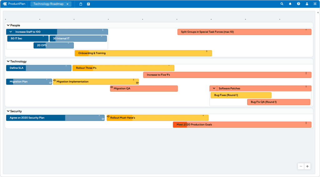 In the example illustrated here, the roadmap is divided into three different categories: People, Technology, and Security. The colors indicate the status of each initiative. The roadmap can have a time horizon such as the next year.