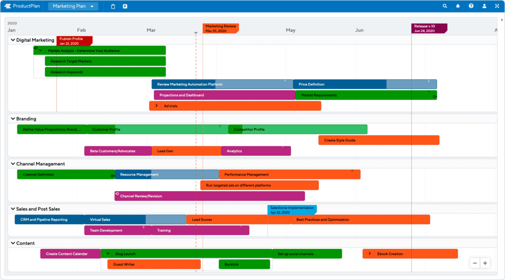 In the example above, the marketing plan is broken into specific buckets — product and service management, branding and marketing, channel management, and sales and post-sales. Drilling into any of these buckets, or any of the specific categories under them, will provide a more granular view of specific tasks and other details. But this high-level view is a great way to quickly check on the plans’ progress and reassess priorities when necessary.