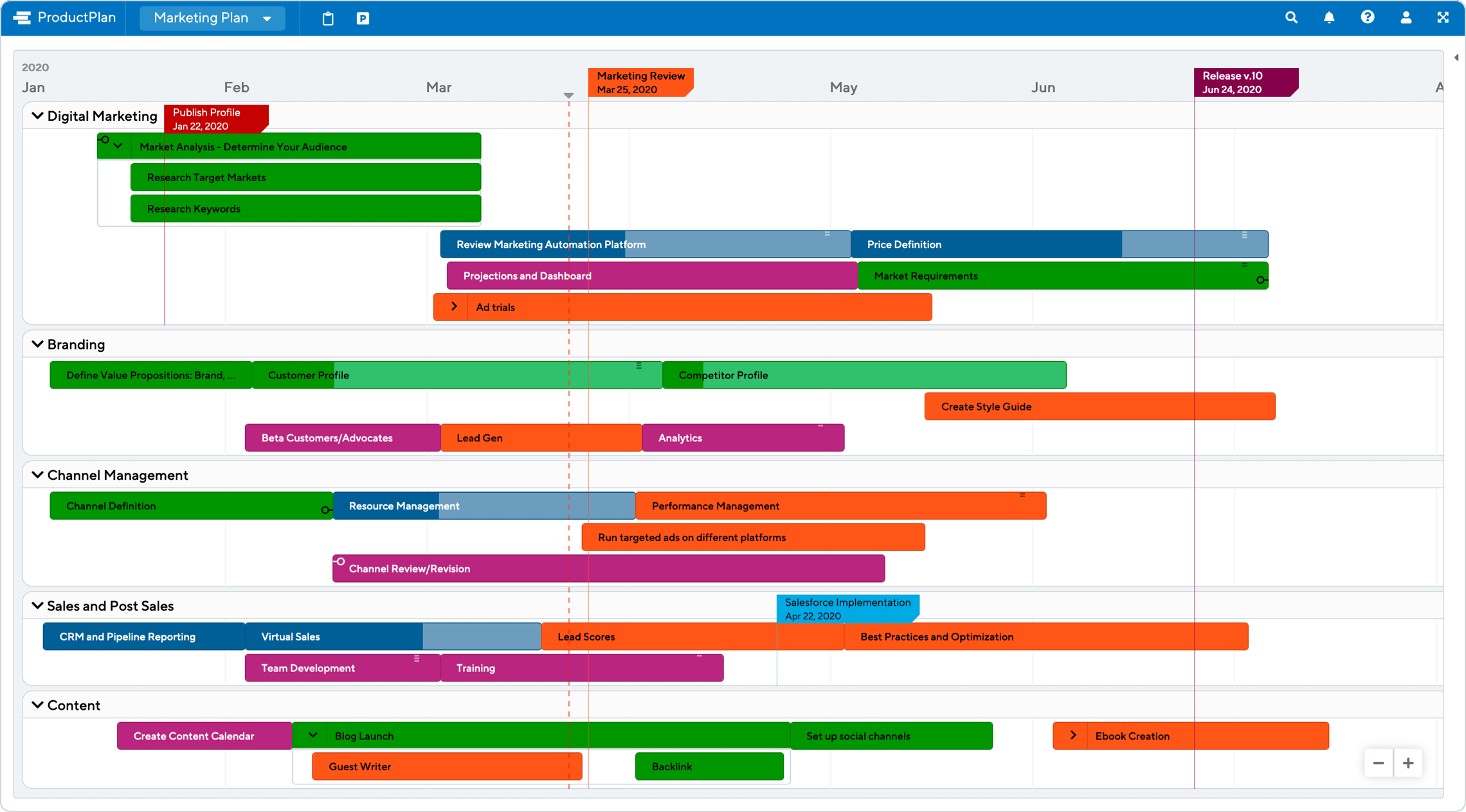 A marketing plan is a blueprint that outlines your marketing strategy and efforts. It is a high-level roadmap that provides your stakeholders with a general overview of marketing initiatives across different categories. In the example above, the roadmap is organized by the type of initiative and color-coded by the phase of the initiative. You could also categorize initiatives by their owners or by strategic goals, such as increasing revenue, expanding to new markets, or reducing churn.