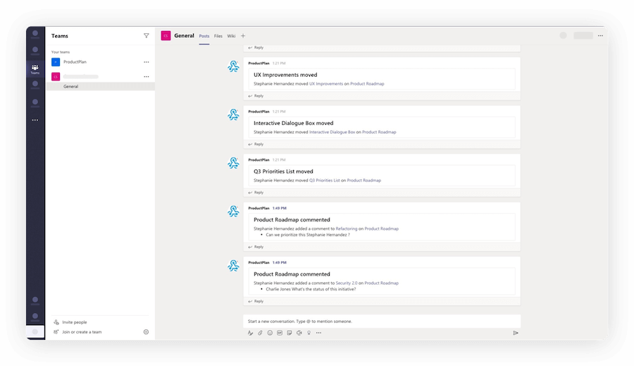 Not all stakeholders will be power users of collaboration tools, so product leaders should continue relying on other tactics to suit the preferences of different types of stakeholders, particularly executives that might have a different lens. Some may prefer one-on-one meetings or other modes of receiving and processing product roadmap updates and strategy revisions. Learn more about how Microsoft Teams and ProductPlan integrate.
