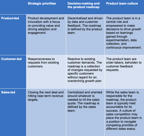 To better understand the concept of a product-led organization, it’s helpful to look at the differences between product-led, customer-led, and sales-led organizations. First, some quick definitions: