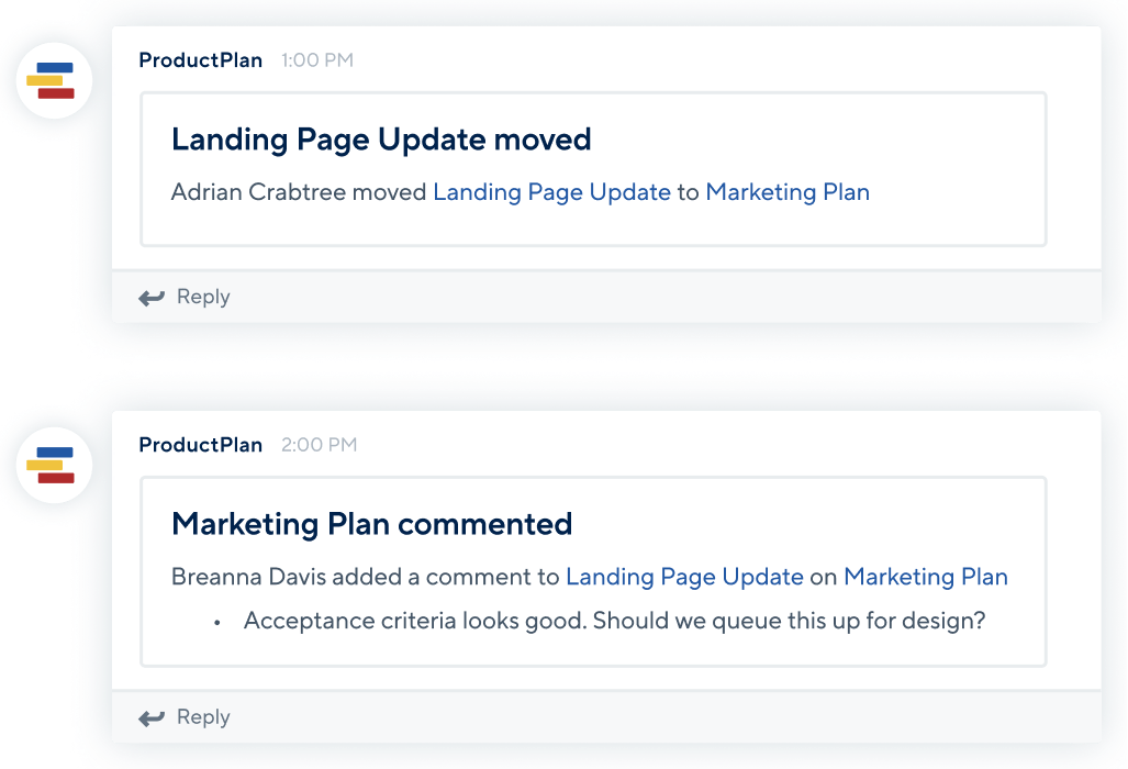Get notified in real-time when someone comments on your roadmap. Keep the conversation going in MS Teams or jump into ProductPlan with a single click.