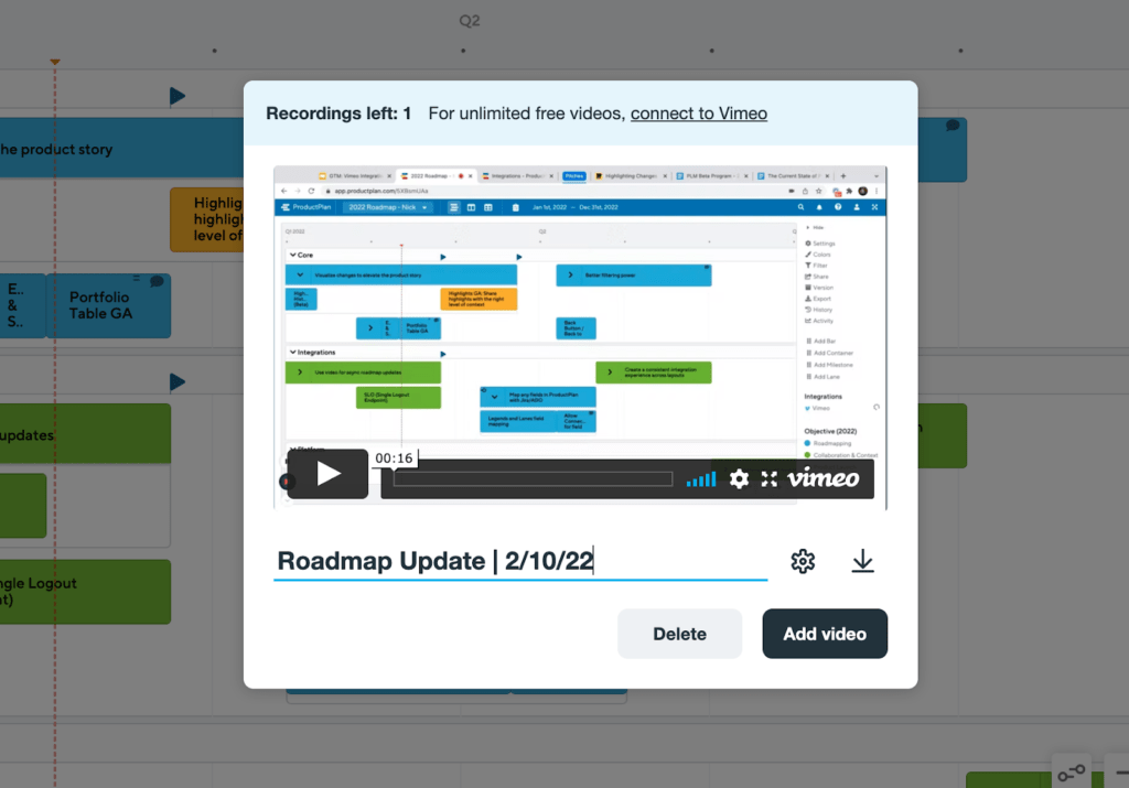 Guess what? It’s a reality with ProductPlan’s Vimeo integration. Product leaders can now communicate with their product team and stakeholders via recorded video. You can now walk individuals through your roadmap.
